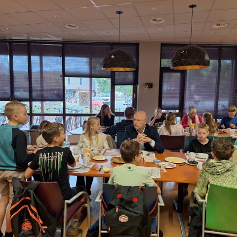 Groep 8 van Basisschool De Akkerwinde uit Hooge Mierde ontbeet vanmorgen samen met burgemeester Annemieke van de Ven.